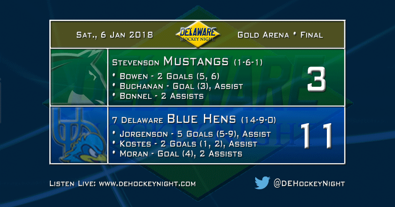 Junior right-winger Anthony Jorgenson’s impact on the third line and the penalty killing unit doesn’t often translate to the scoresheet, but his five goals—three in the second period alone—on Saturday night (Jan. 6) propelled the University of Delaware Blue Hens (14-9-0) Division 2 men’s hockey team to an 11-3 win over the Stevenson Mustangs (1-6-1) at Gold Arena in Newark, Del.
