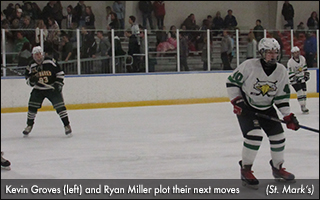 Not to be deterred, St. Mark’s turned the tables in a big way in the second period, notching three straight goals in the first nine minutes all from close range. Captain Joey Centrone tied the game at two with his seventh of the season at 4:16, stickhandling through slot traffic and backhanding the puck past Grable from right in front of the crease; Kevin Groves’s sixth-minute redirect of an initial Jack Wagner shot from the left half wall gave the Spartans their first lead of the game; and freshman William Ralsten extended the Spartans’ lead to 4-2 at the 8:58 mark of the middle frame after intercepting the puck, deking to evade defensive pressure, and punching a goal beneath Ralsten’s blocker while on a power play.